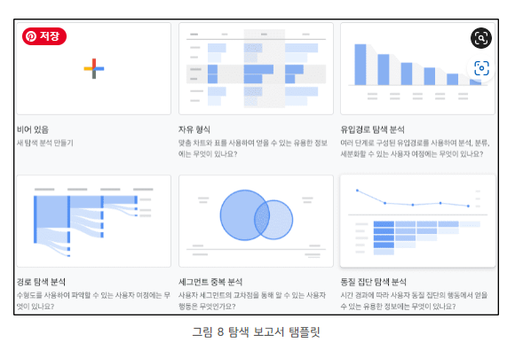 탐색 보고서는 GA4에서 활용가능하고 기본적은 차트부터 시작해서 유입경로 분석, 세그먼트 중복 분석 등 총 12개의 템플릿이 제공되어 심도있게 분석이 가능해졌다.
